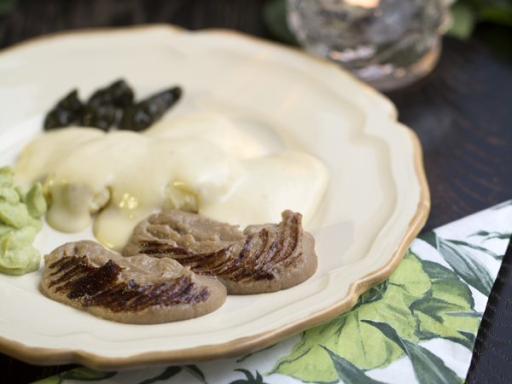 Sprængt nakke med aspargessauce, kartofler, broccoli og persille (cremet)