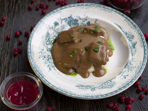 Kalvehjerter i flødesauce, kartoffelmos, tyttebær og persille (cremet)