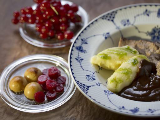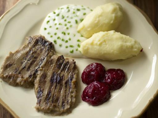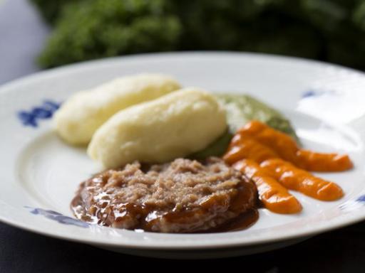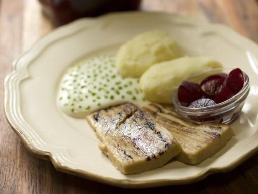 Rullesteg med kartofler, skysovs, rødkål og agurkesalat (cremet)