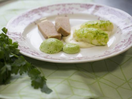 Kalvehjerter i flødesauce, kartoffelmos, tyttebær og persille (gratin)